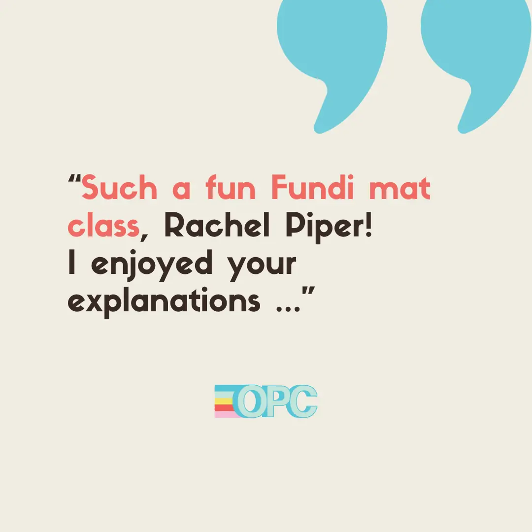"Such a fun Fundi mat class, Rachel Piper! I enjoyed your explanations and being able to check my double leg stretch again at the end! Thank you!"
