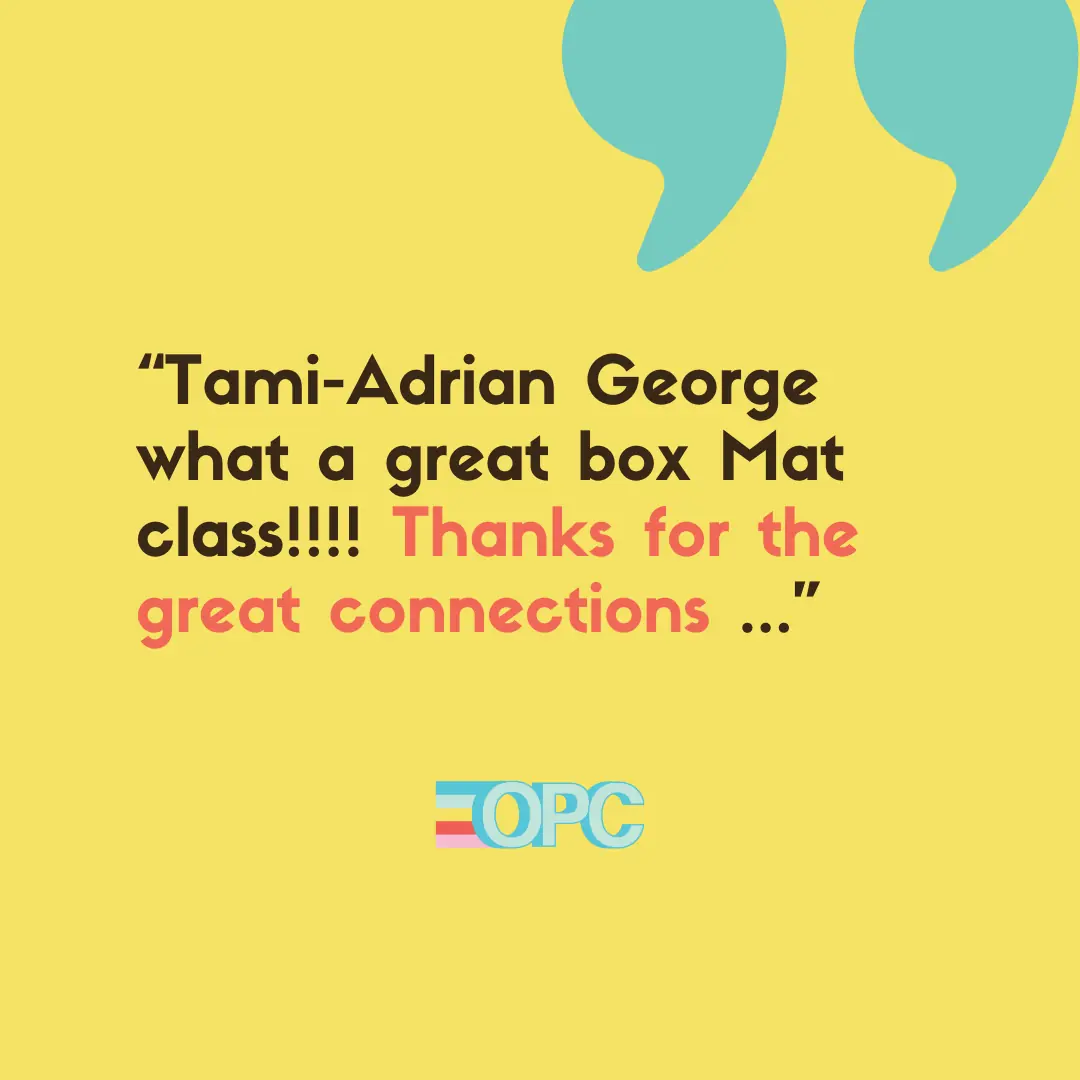 "Tami-Adrian George what a great box Mat class!!!! Thanks for the great connections and also great inspirations to bring into the stuio. Loved it."