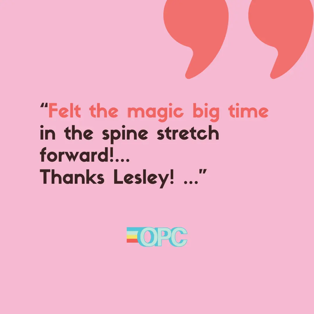 "Felt the magic big time in the spine stretch forward! I've never been able to connect with my seat and outer thighs in that exercise but today I definitely did! Thanks, Lesley!"